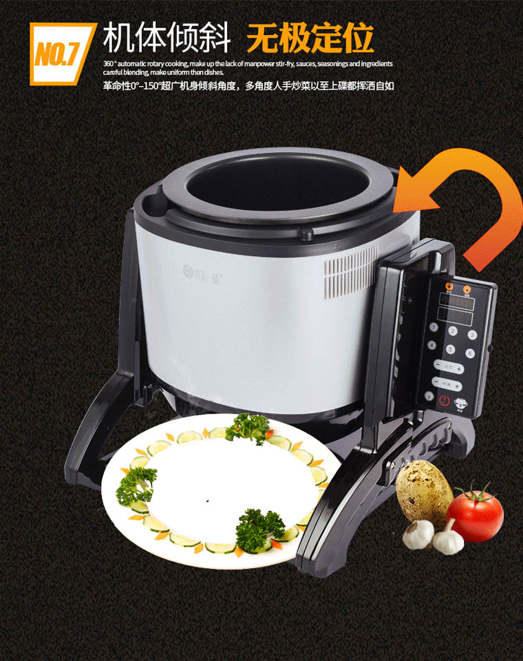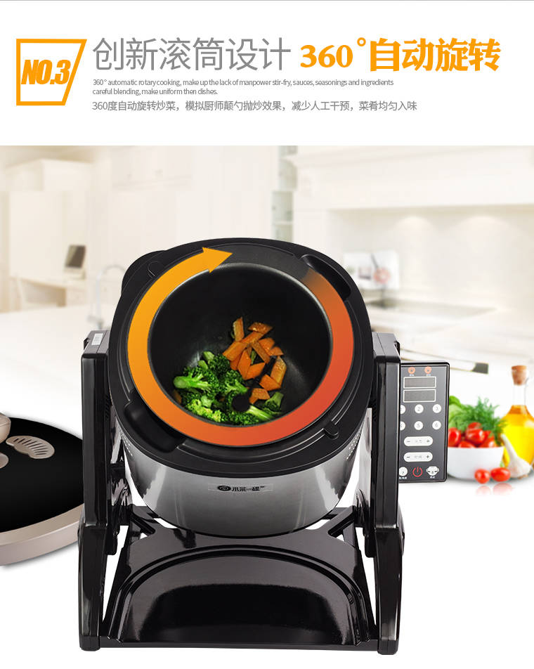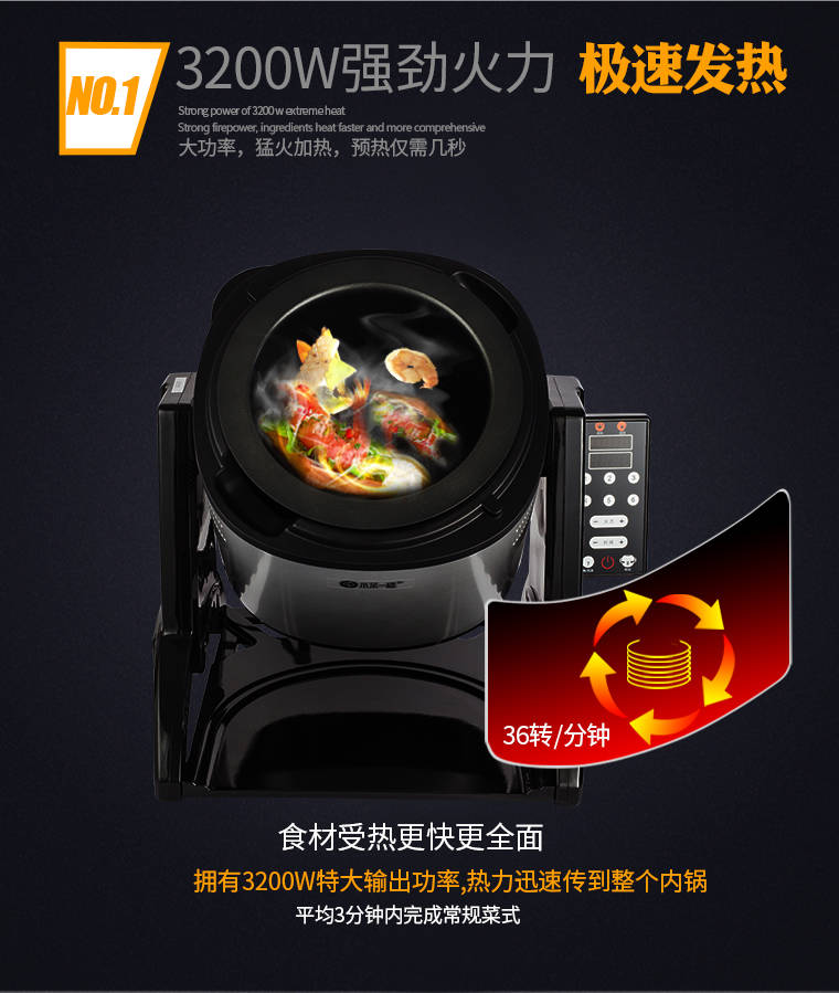 自動精準控溫,解決廚師最難掌控的火候問題 自動翻炒,節省人力,降低勞動強度,降低用工要求 標準的時間控制,可調整可記憶 食品級不粘涂層,食材不焦不糊,提升出品品質。 一人同時可操作4-6臺,提升效率,節省人工