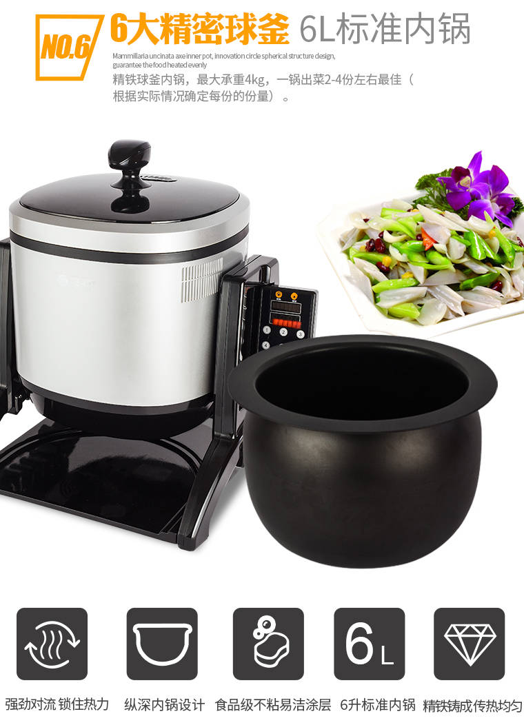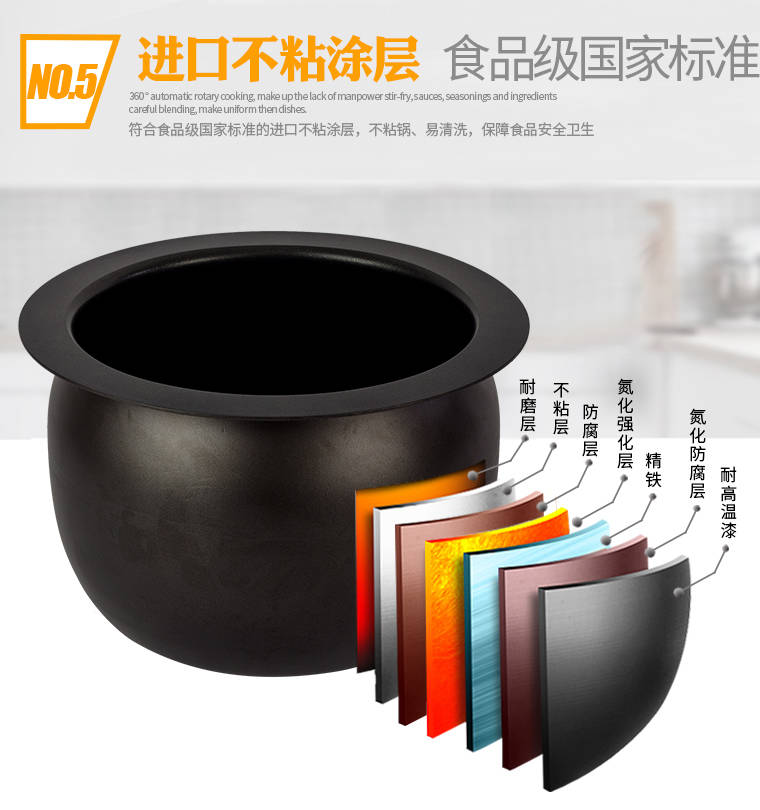 先進的IH電磁加熱原理,加熱迅速,受熱均勻 滾筒式翻炒,模擬廚師顛勺拋炒 紅外線精準控溫,精準掌控火候 預留6個記憶功能鍵,自主定制每個功能 火力5段可調,提供暫停功能