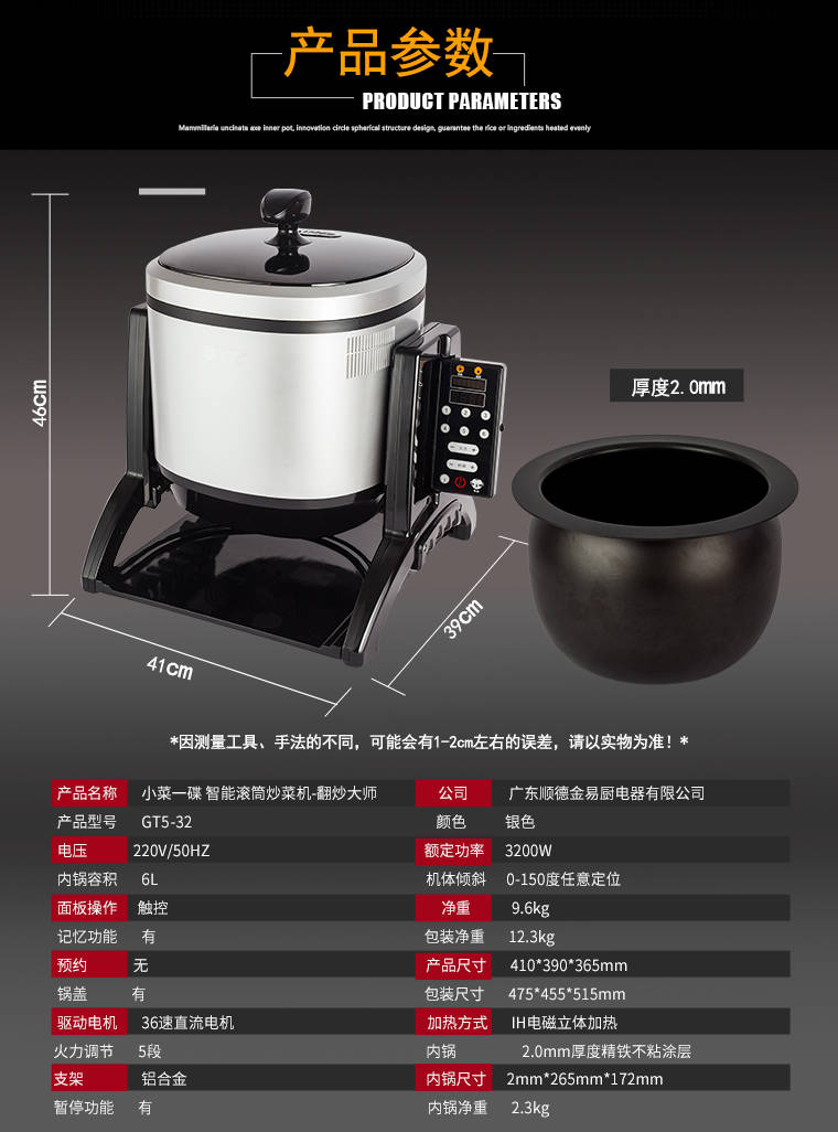 GT5-32滾筒式炒菜機,采用先進的IH電磁加熱原理,滾筒式翻炒,紅外線精準控溫,6L一次1-2份標準出菜量。1人輕松同時操作4-6臺機器。簡化操作、提升出菜效率、穩定菜品,降低用工要求,免去管理苦惱??沙床恕⒊达埛勖妫措u、麻辣香鍋等。適合連鎖加盟餐飲、中小餐館、外賣、新開門店。助力打造中餐標準化和智惠餐飲。